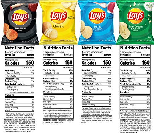40 count pack featuring 10 of each of these Lay’s potato chips favorites in 1 oz bags – Classic, Barbecue, Sour Cream and Onion, and Salt and Vinegar